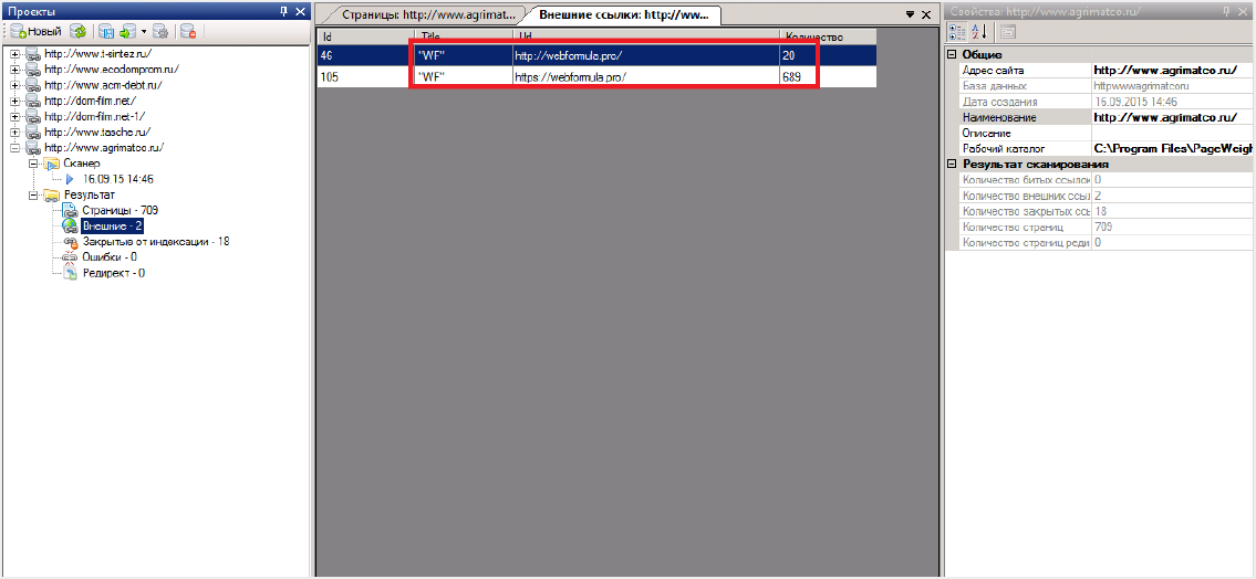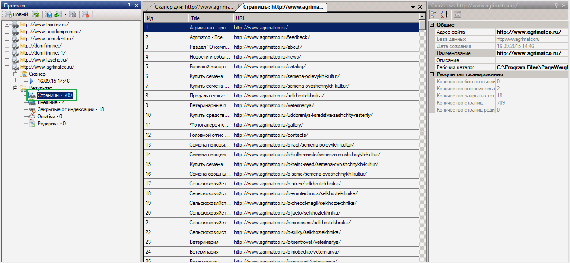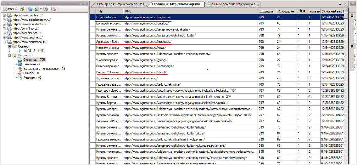 - Общее количество страниц на сайте доступное при переходах по внутренним ссылкам и не закрытых в robots.txt бота PageWeight– 709.