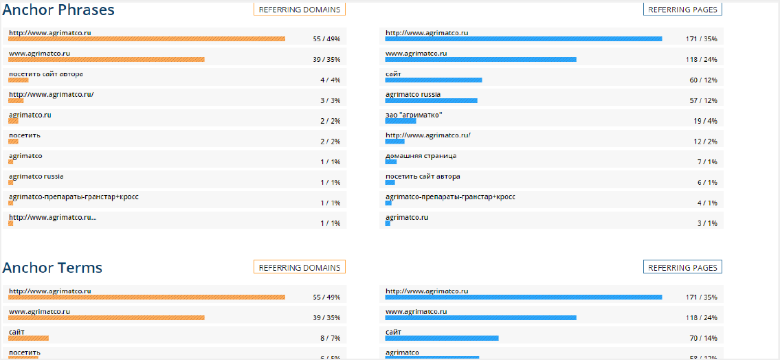- 40%-50% - "безанкорные" и брендовые ссылки, т.е. с анкорами '' Агриматко'', " http://www.agrimatco.ru/", " www.agrimatco.ru", "на сайте".