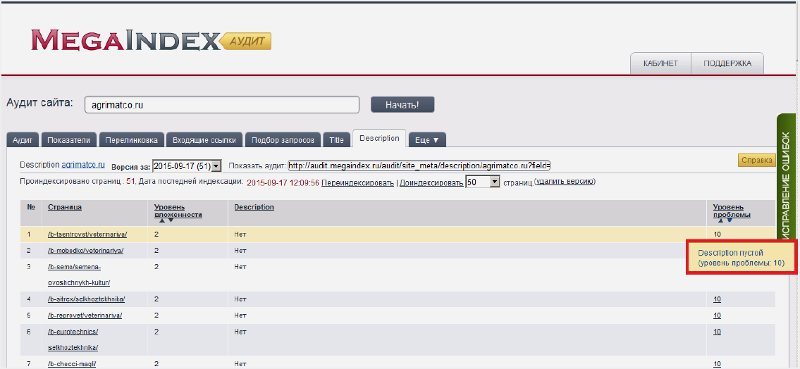 - Страницы должны иметь заполненные мета теги description, т.к. это важная зона документа, она участвует в ранжировании и прохождении документом кворума. Для ПС Google ошибка почти фатальная.